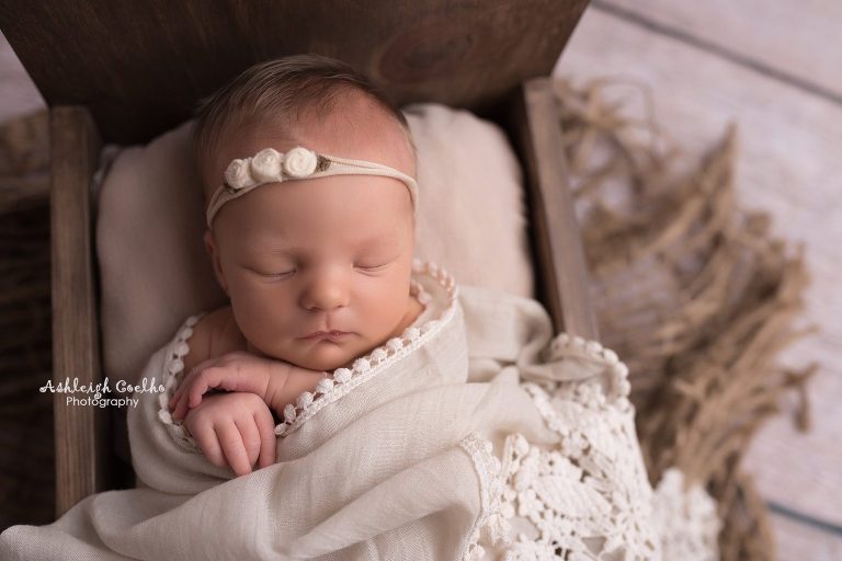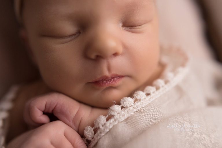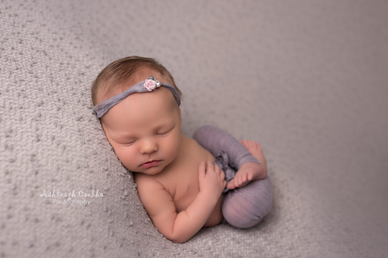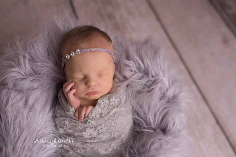 Blakely was a very easy-going baby to photograph – I was able to get lots of different set ups with her and she just went with the flow! One of my favorite shots from this session is the first one below – the huck pose using a grey backdrop and purple pants/headband. I also love the set up in the baby bed…I especially the close-up of her lips!