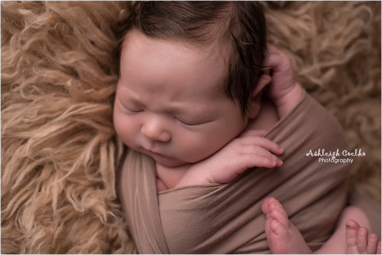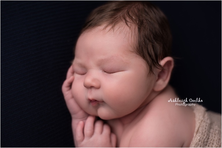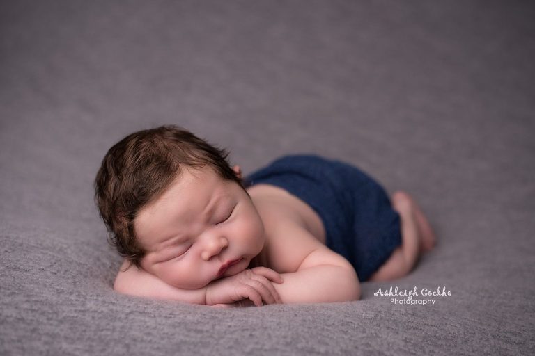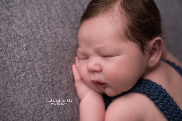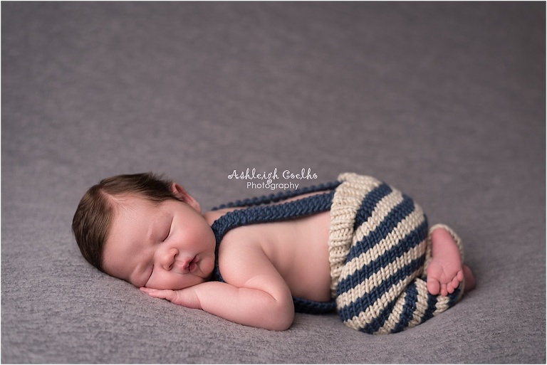 First off, Holden was a pretty big baby – birth weight was 9lbs, 15oz. I love working with bigger babies – they’re so cuddly! I had a newborn outfit picked out that I had recently purchased from Beautiful Photo Props (see it here), but once I saw Holden in person I knew it wasn’t going to work. I just so happen to have a bigger outfit that would normally fit a 6 month old baby boy – whew! I didn’t think I’d ever use it for a newborn session, but I was wrong! It fit him perfectly!