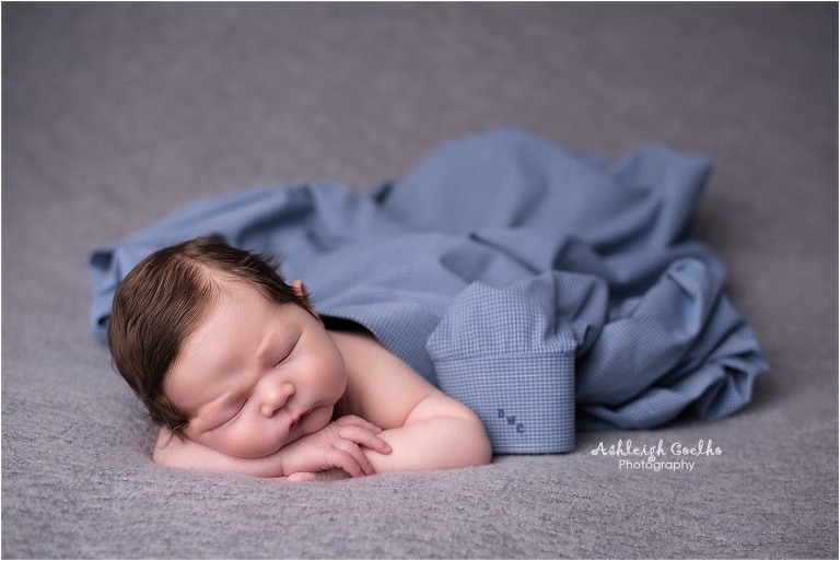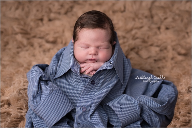 We also incorporated a dress shirt from Holden’s great-grandfather – whom he received his middle name from, Douglas. His great-grandfather always had his initials on his shirts, so I made sure you could see the initials in both shots I took of him wearing it. I wrapped the shirt around Holden while he was in the potato sack pose and he looks like such a cute little guy – especially with all that hair. I also incorporated it with the chin on hands pose.