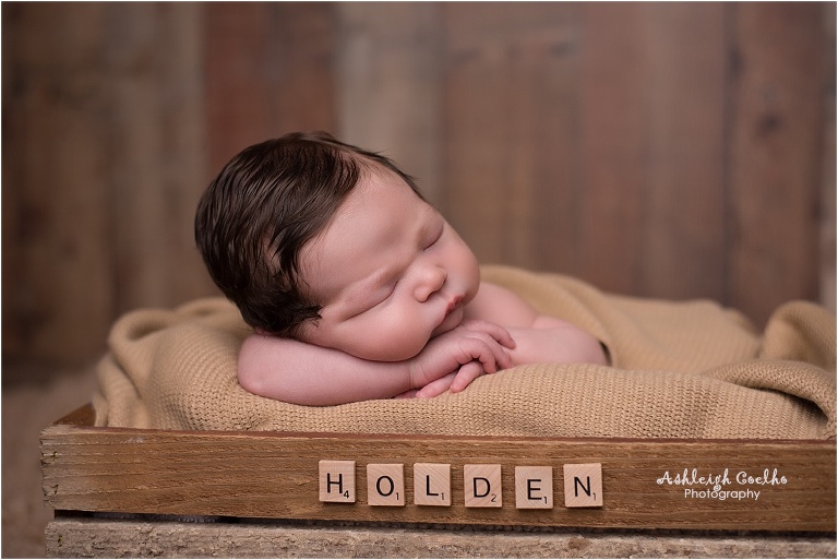 Another item we added into his newborn session was Scrabble letters. We used these letters during their maternity session as well so it was fun to add it to the side of a crate during a prop shot. It’s little touches like these that make sessions stand out and more special for parents.