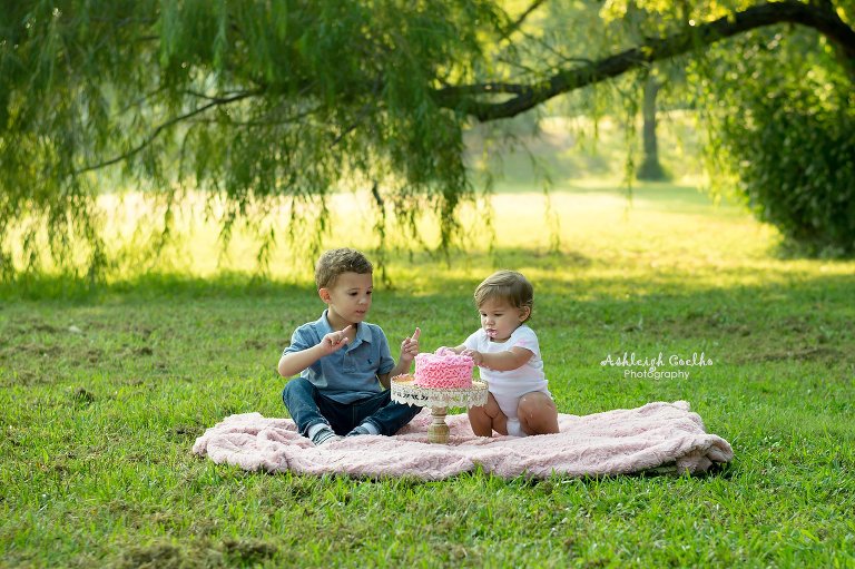 Landyn Rose was such a joy to photograph her milestone one year old/cake smash session last fall of 2017.  Her session was photographed in the morning at Bonnie Wenk Park in McKinney and it couldn’t have gone any better.  The morning light was so pretty, Landyn was in a great mood, her big brother Beckett was hilarious in the few shots he made an appearance in, and the willow tree at the end where we did her cake smash was the perfect ending.