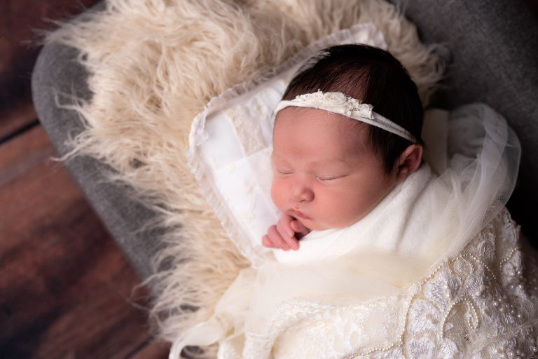 2019 is the year of the PIG! When May’s mom mentioned she wanted to incorporate something for that since May’s dad is Chinese, I called a great friend of mine – Nicole from Loop Da Loop Crochet – to crochet a newborn-sized little big for Miss May to hold (see below). We also incorporated an adorable piece of fabric that is actually May’s curtains in her nursery. I really think it is so special to incorporate extra pieces that are so meaningful to parents! Oh – and don’t let me forget to mention we also included mom’s wedding dress – so pretty!!