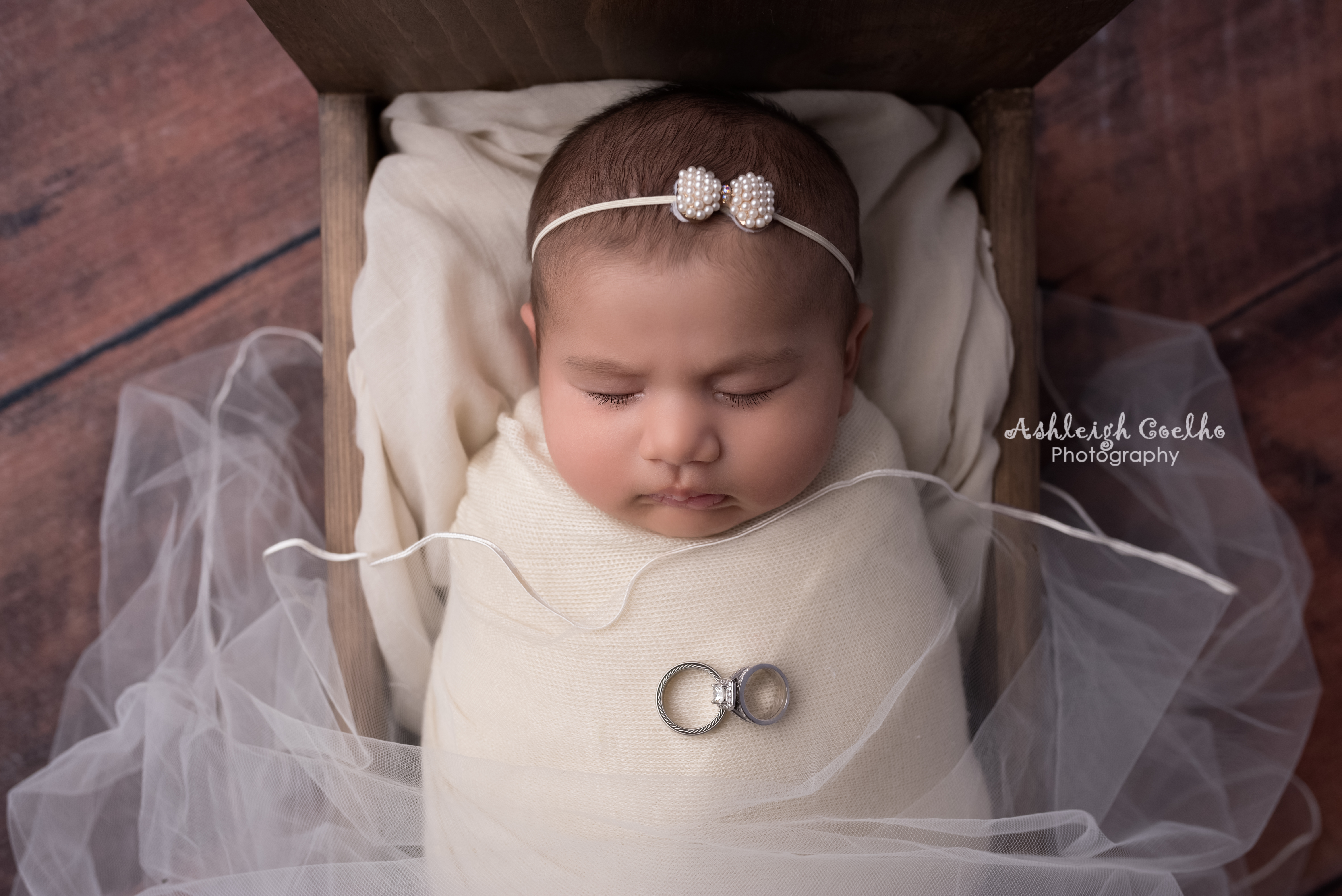 I had a little fun with my daughter recently on a rainy weekend – I pulled out my wedding dress, veil, rings, and accessories and created these beautiful images! I didn’t shoot these until she was 8 weeks old – I was just too exhausted at the beginning to do much. All I can say about being exhausted after having a baby is gosh, was I reminded again how rough it is right after giving birth and how I love being able to let my clients sit back and relax while I capture pictures of their newborn for them!