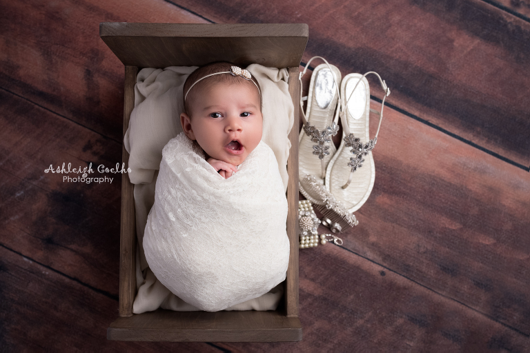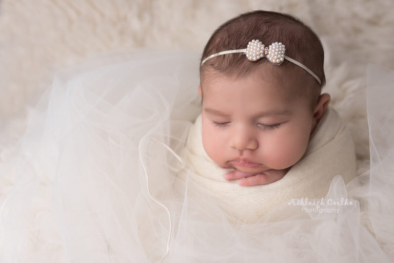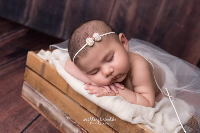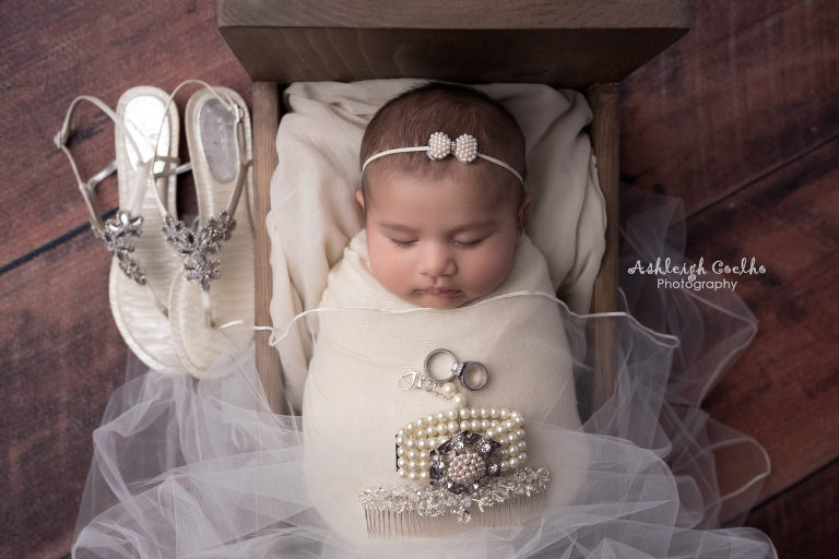Anyway – I got creative with wanting to incorporate not only my wedding dress, but also my veil and accessories. With her being older I knew I needed to wrap her for most of the images which actually turned out perfectly so I could get more variety in a quicker time frame and I think her wrapped with my wedding dress looks stunning! The bum up pose of her laying on my wedding dress was hard work with her being 8 weeks old – I had to make sure she was extremely sleepy and I actually tried a few separate times until she would stay asleep while I could slowly position her. Hence why newborn photographers try to capture newborn babies between 6-14 weeks old – they’re so much easier to get into sleepy, non wrapped positions.