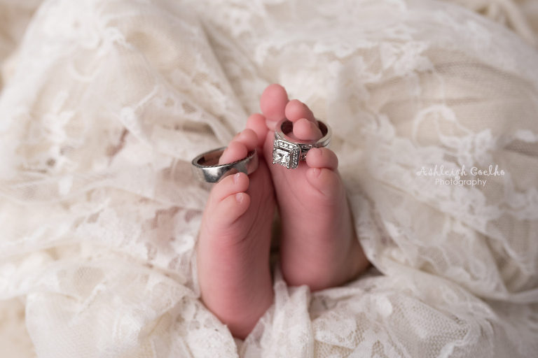 I had a little fun with my daughter recently on a rainy weekend – I pulled out my wedding dress, veil, rings, and accessories and created these beautiful images! I didn’t shoot these until she was 8 weeks old – I was just too exhausted at the beginning to do much. All I can say about being exhausted after having a baby is gosh, was I reminded again how rough it is right after giving birth and how I love being able to let my clients sit back and relax while I capture pictures of their newborn for them!